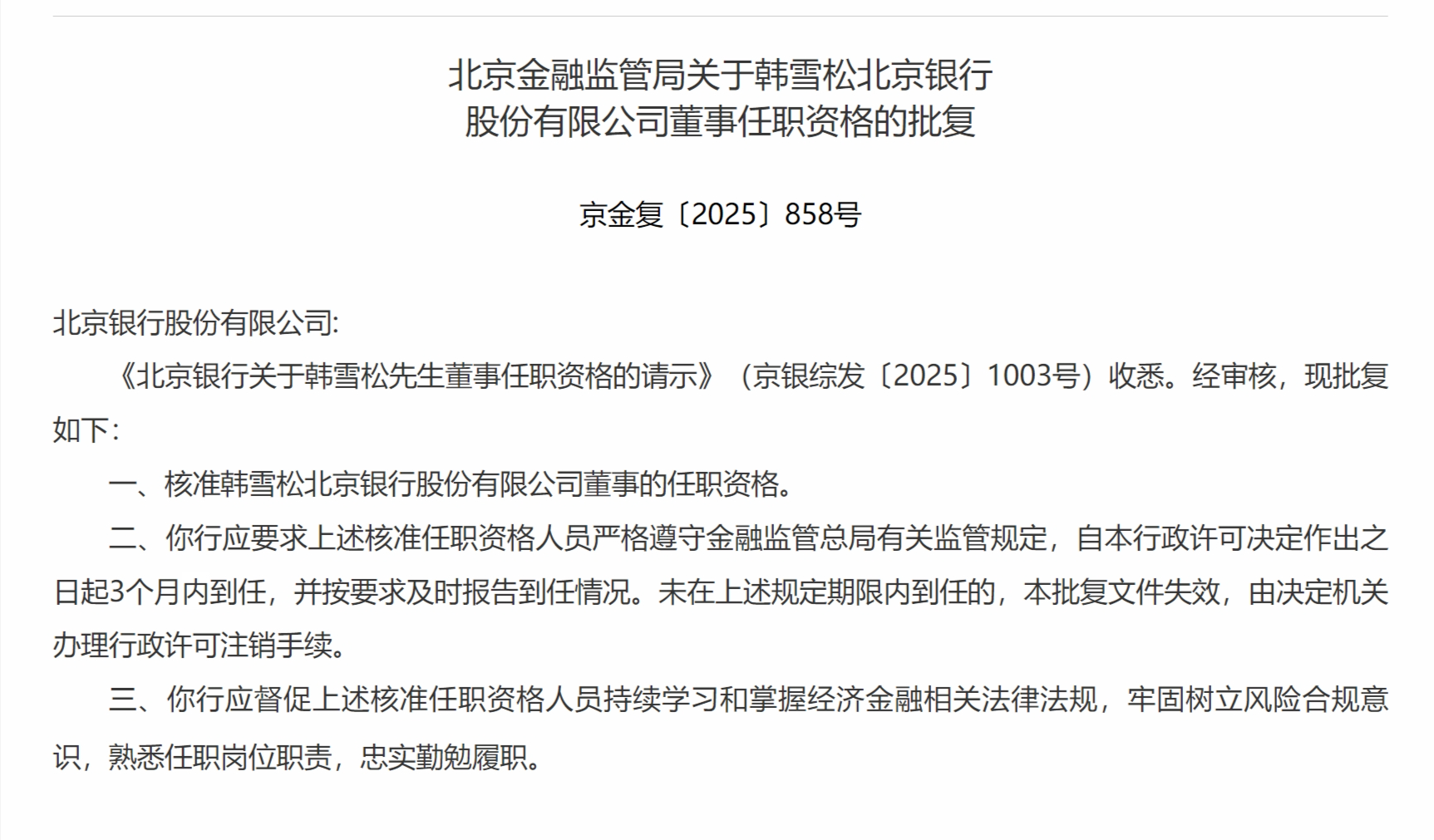 12月26日,北京金融监管局发布关于韩雪松北京银行股份有限公司董事任职资格的批复,核准韩雪松北京银行股份有限公司董事的任职资格。