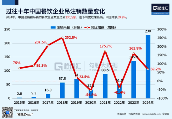 大家看看下面这个数据,很令人揪心。从图中我们可以清晰看到,2018年是个拐点。我们不知道2018年发生了什么,但数据显示,2017年以及之前,我们每年倒闭的餐饮企业只有10万家上下。但仅仅7年后,也就是2024年,当年餐饮企业倒闭数量达到了230万家,倒闭餐饮企业数量创下历史新高,是2017年倒闭数量的14倍,比上一年也就是2023年的135.9万家,也增加了近百万家,增幅高达69%,显示形势其实是在进一步恶化。