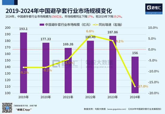 格隆直接上数据:2024年中国避孕套市场规模156亿元。这是什么概念呢?2023年避孕套卖了187.86亿元。2024年足足下降了17%——这个数据,比伟哥,更加“萧条”。