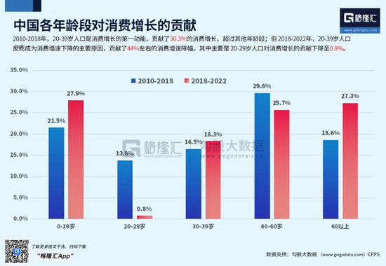 大家看一下下面这张图:2010-2018年,社零消费年复合增速为12%,2018-2022年年均增速降到了6.1%,而从不同年龄段的消费情况来看,20-39岁人口是消费增速下降的主要原因,贡献了44%左右的消费增速降幅。