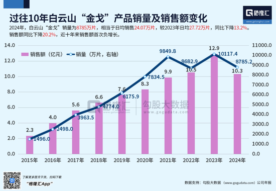 白云山年报显示,国产伟哥代表金戈的销量,从2023年的1亿片,大幅降到8785万片,日均销量则从27.7万片降到24万片,同比下降13.2%。销售额呢?从12.9亿元下降到了10.3亿元,同比降幅为20.2%。