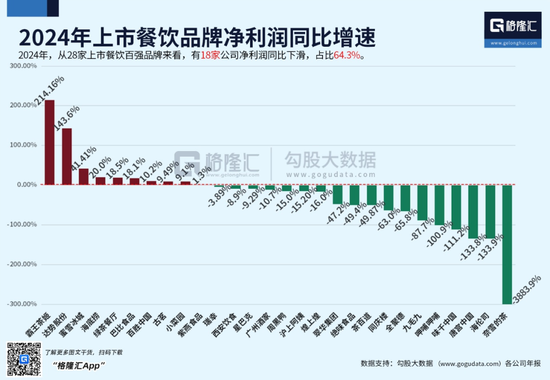 体现到行业利润上,餐饮利润大幅下滑。2024年,28家上市餐饮百强品牌中,有6家亏损,18家净利润同比增速下滑,亏损+利润增速下降的企业占比达到了恐怖的86%。
