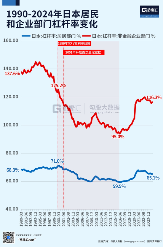 可是这些极度宽松的货币政策并没有快速扭转日本居民和企业部门的去杠杆进程。日本央行1999年就把利率降到0,可是2000年到2015年,这15年的时间,日本企业和居民仍旧在加速去杠杆。1999年到2015年,日本企业部门杠杆率从125.2%降至低点98%,居民部门杠杆率则从71%一路降至59.5%。