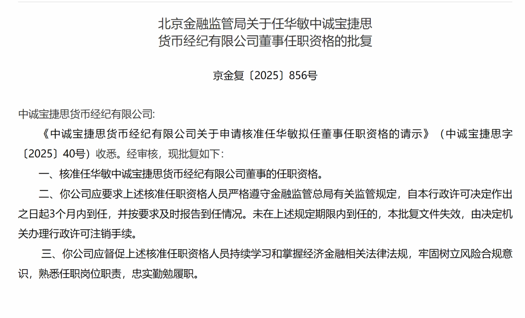 12月26日,北京金融监管局发布关于任华敏中诚宝捷思货币经纪有限公司董事任职资格的批复,核准任华敏中诚宝捷思货币经纪有限公司董事的任职资格。